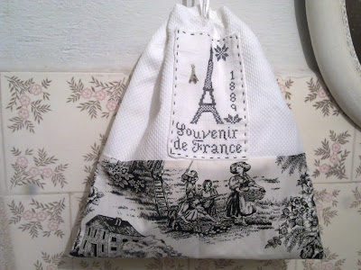 Viciei em costurinhas básicas, principalmente nesses sacos de tecido que conheço como embornal. Esse, com estampa toile de jouy e bordado em ponto cruz será usado para guardar os ornamentos de junho.