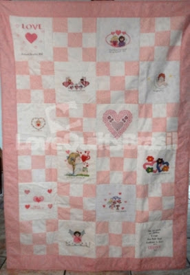 Cada acolchoado é formado por 12 blocos em patchwork e 12 blocos em ponto cruz, sendo um com o nome da criança. A foto ao lado de cada acolchoado corresponde ao bloco que eu bordei!